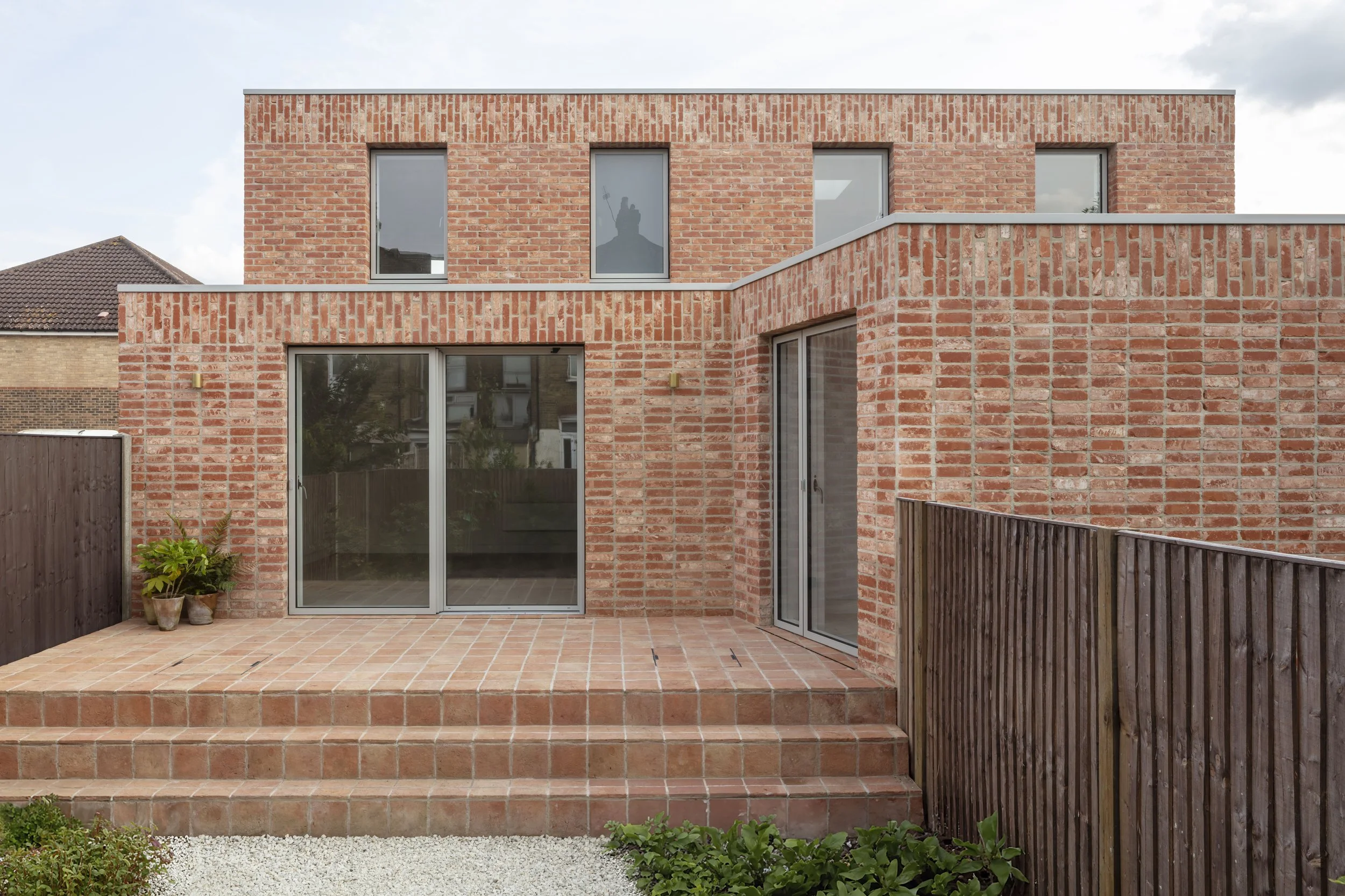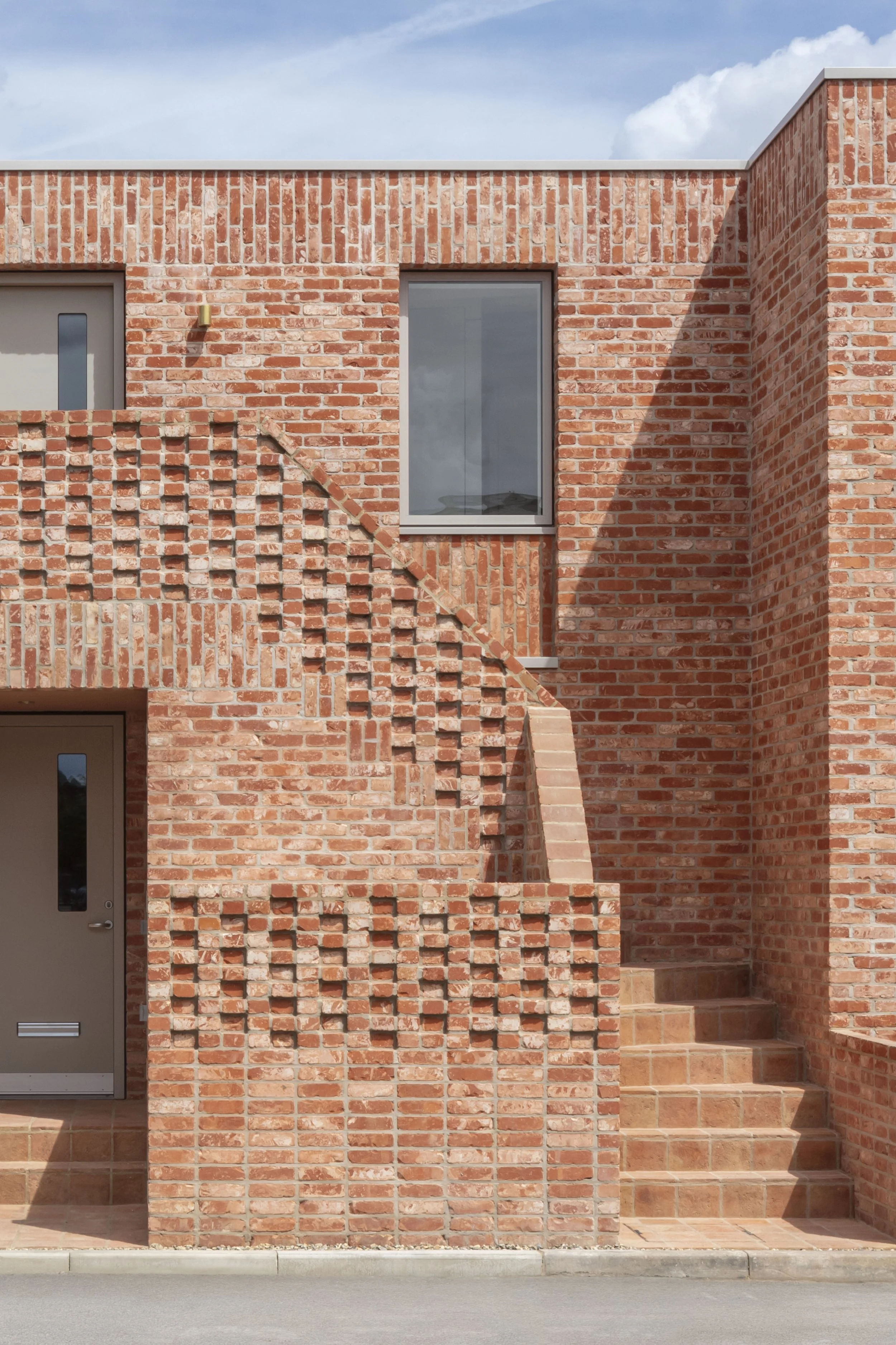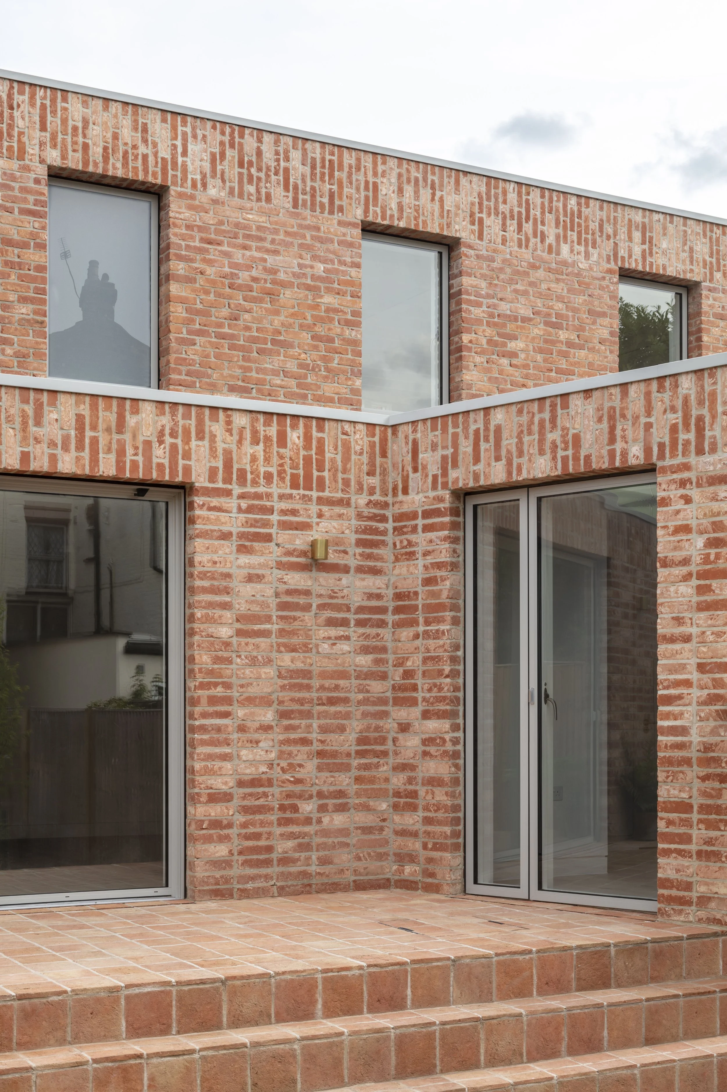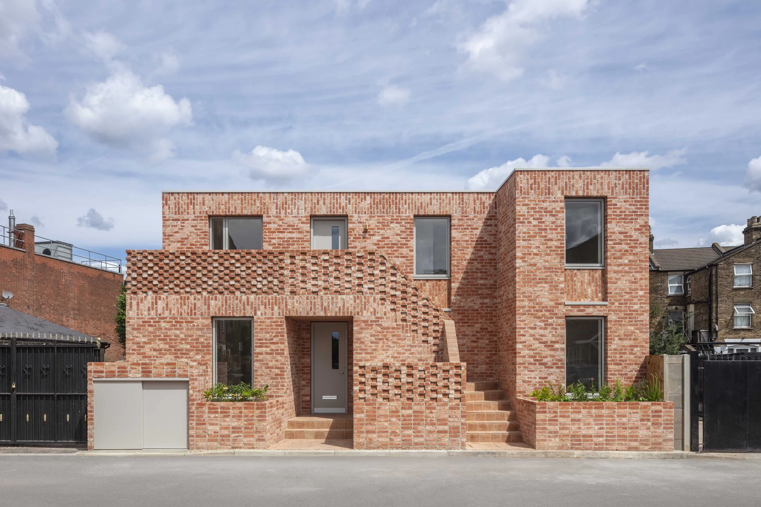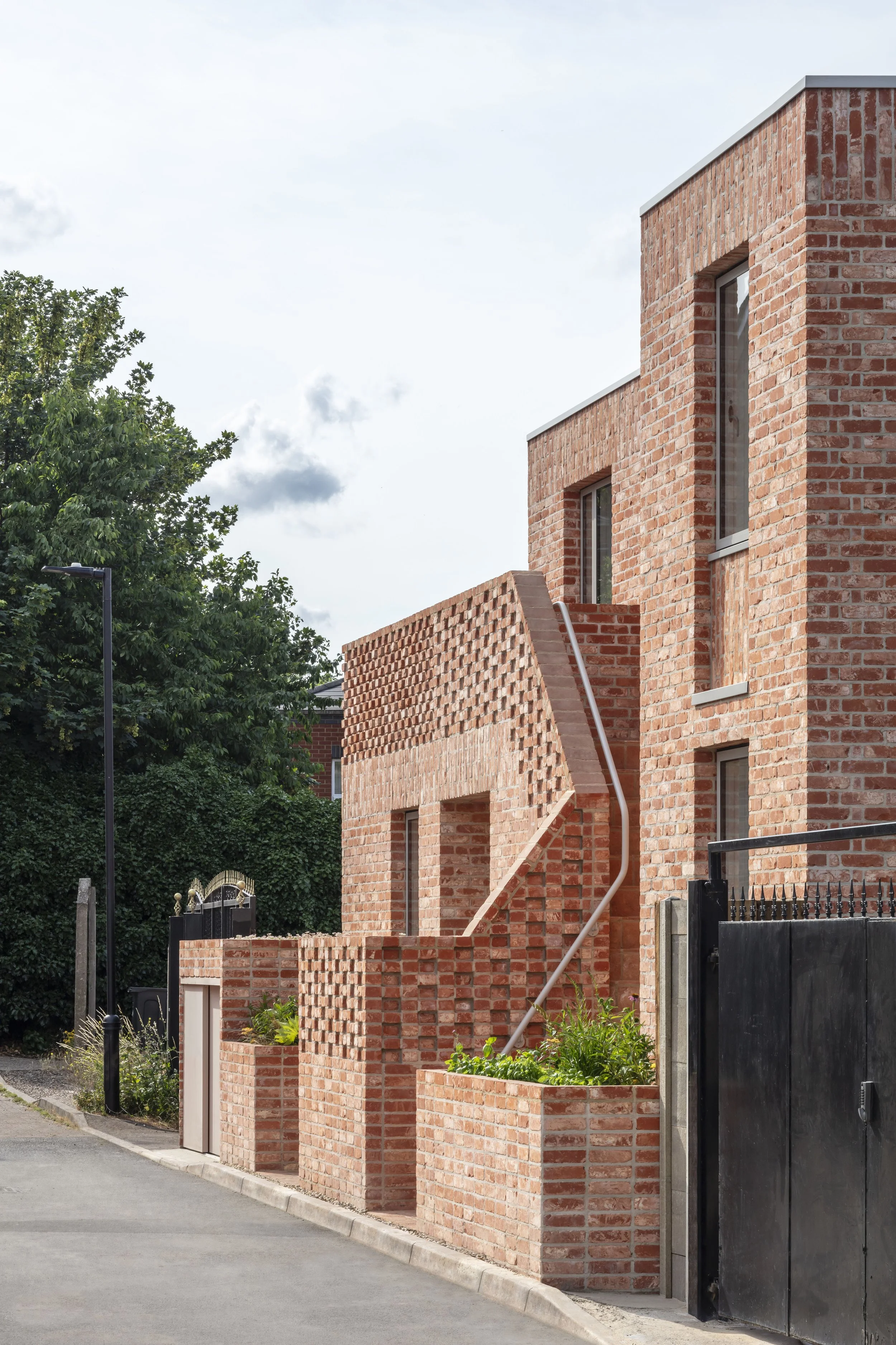 Deep inset openings define entrances, while brick bonds on the front elevation articulate the external stair to the upper dwelling -an architectural feature inspired by traditional mews housing, reinterpreted in a contemporary way. Integrated planters provide defensible greenery and soften the street edge, while secure cycle storage supports the car-free scheme.