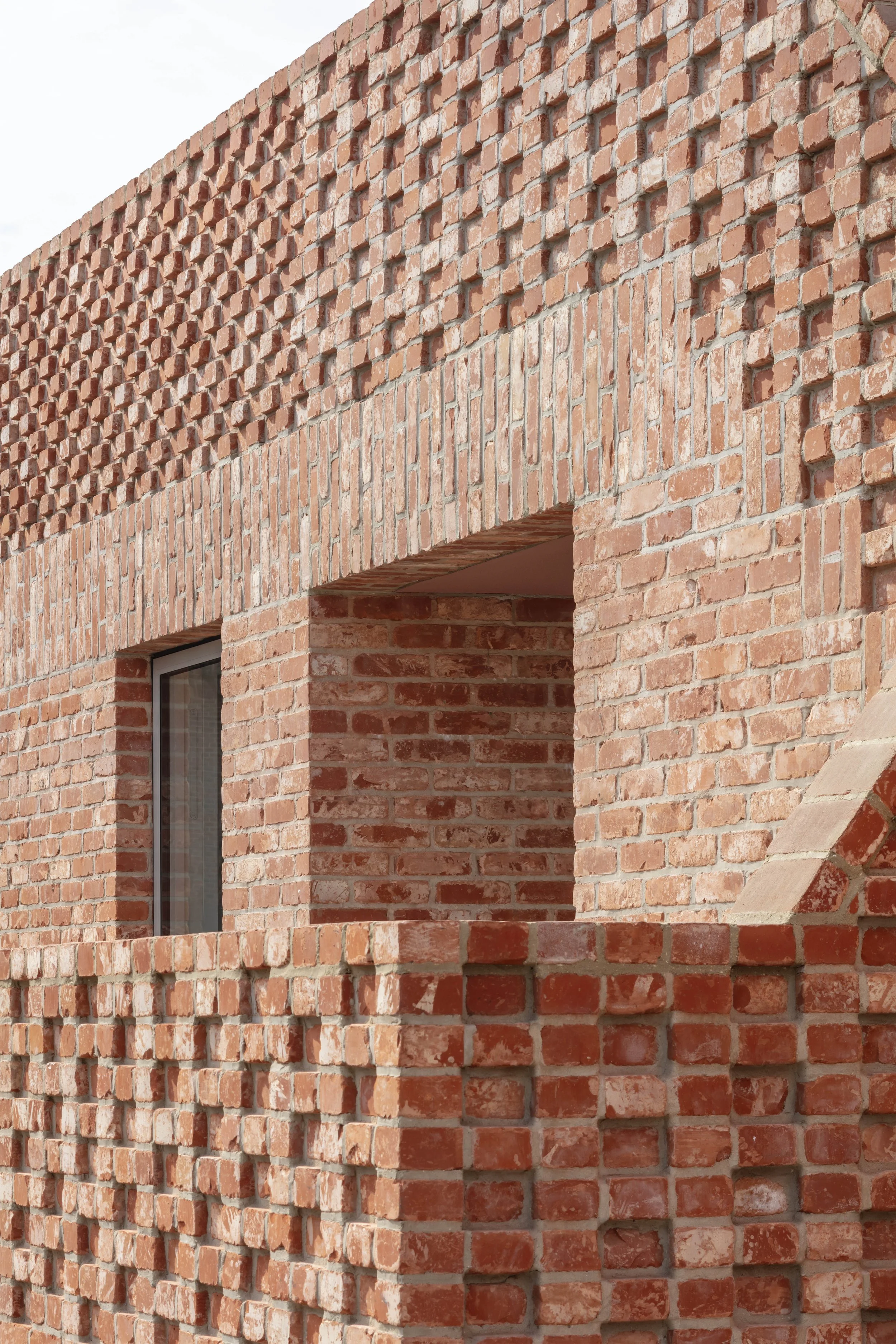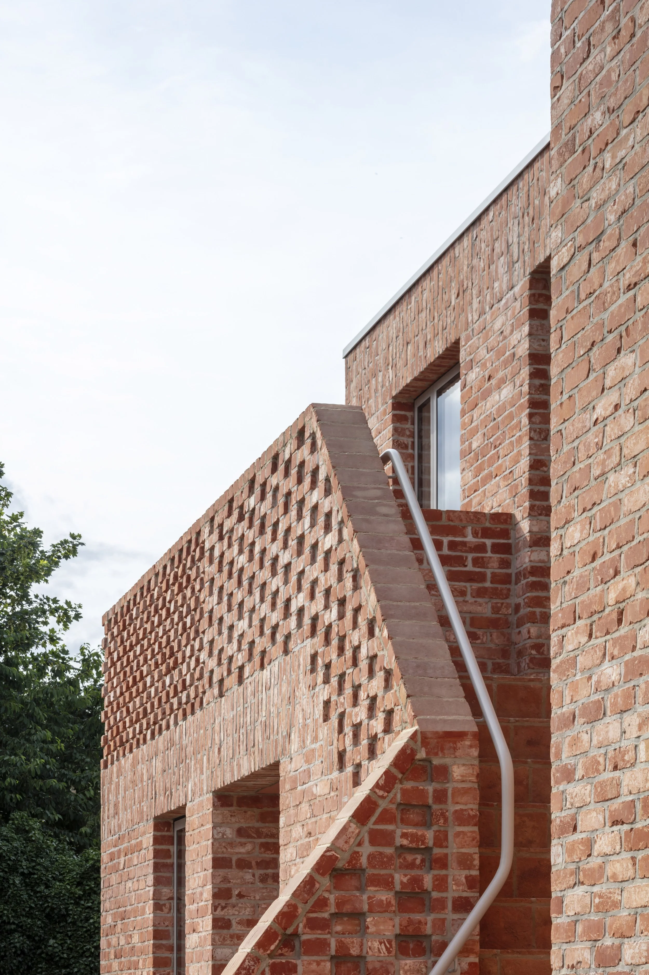 The building is conceived as a sculpted pale red brick form, shaped by site constraints through deep setbacks, undercuts, and pronounced window reveals that create strong relief. Carefully detailed brickwork varies across each elevation, responding to the site’s specific conditions and producing a robust yet characterful appearance.
