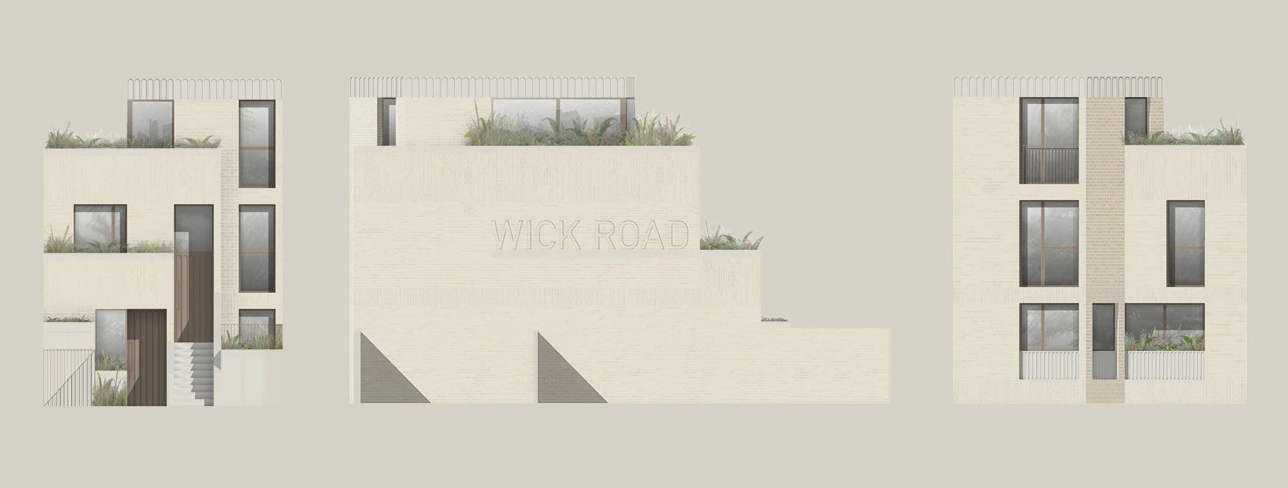 The building is composed as three cascading volumes, stepping away from neighbouring properties to reduce impact and overlooking. A clearly defined entrance sequence provides each home with its own private street access, fostering a strong sense of ownership.