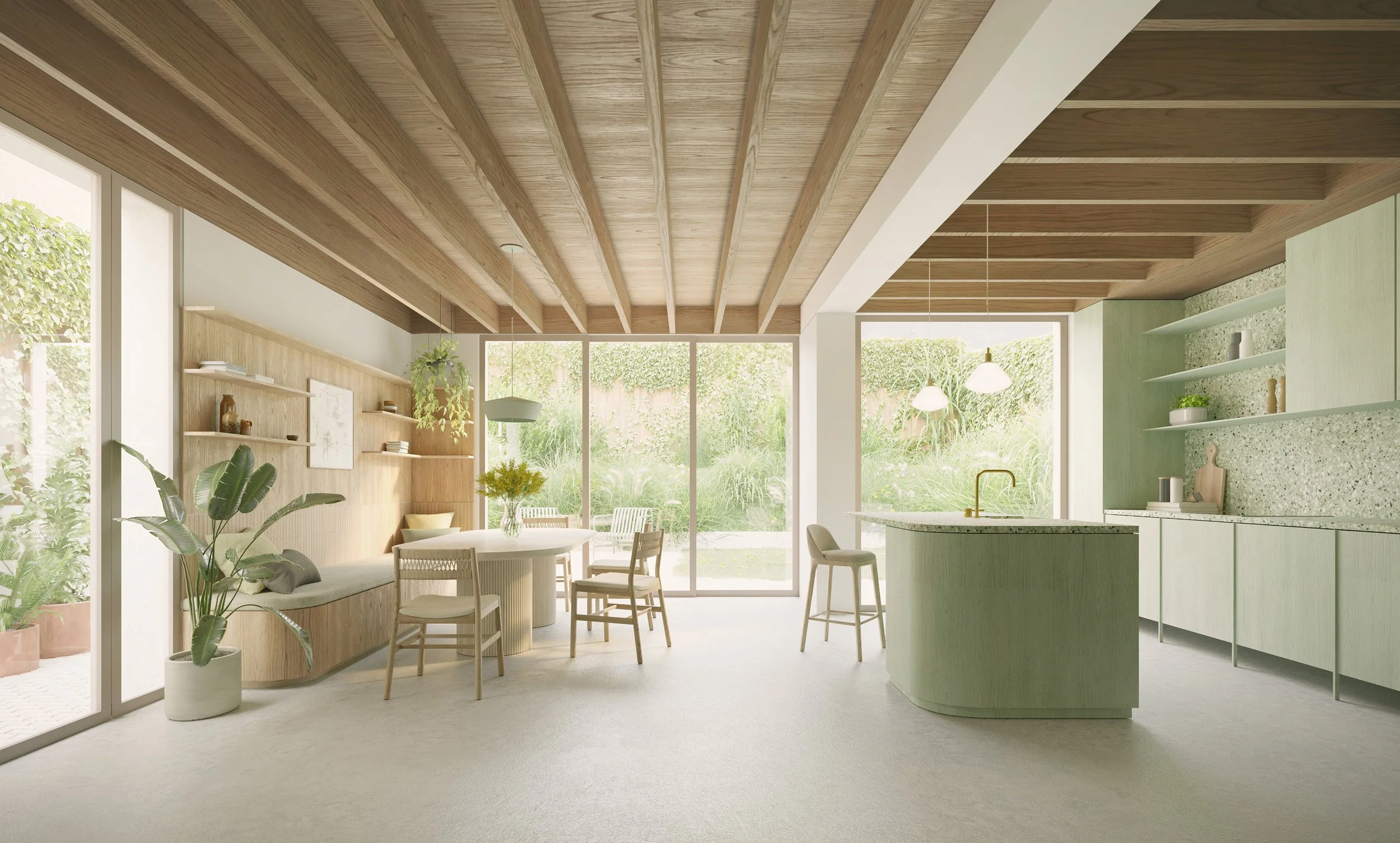 The home exceeds minimum space standards, achieving London Plan best practice for a three-bed, five-person dwelling across two storeys, with a flexible, staggered open-plan layout maximising dual-aspect views.